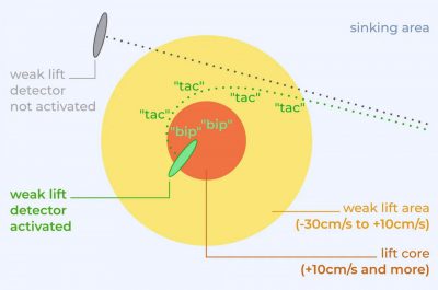 BipBip PRO svaglyftdetektor är en kort buzz-modulering som indikerar svaga lyft (från -30cm / s till + 10cm / s), inte värt att kurva men kan ge dig en antydan om en starkare termik i närheten. På bilden har den grå piloten inte den svaga lyftdetektorn aktiverad. Den gröna piloten aktiverar den och när han når ett svagt lyftområde hjälper summern honom att hitta den termiska kärnan.