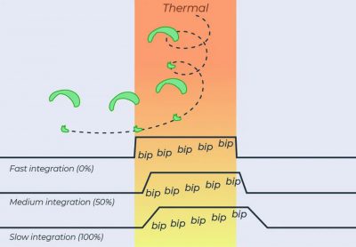 – Lång integreringstid ger ett mer dämpat, integrerat svar för en bättre förståelse av den lyftande luftmassan. Bra för svag termik med stor svängradie.