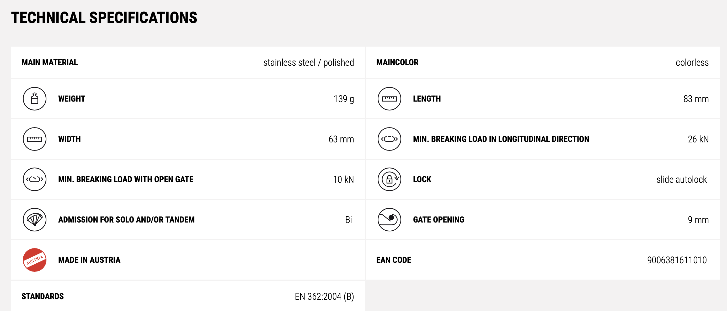 På grund av den högre brotthållfastheten hos karbinhakar i rostfritt stål jämfört med aluminiumkarbinhakar, rekommenderar AUSTRIALPIN generellt att endast rostfria karbinhakar används för tandemflygningar. Motsvarande märkning på karbinhaken är förkortningen ”mono+bi”.