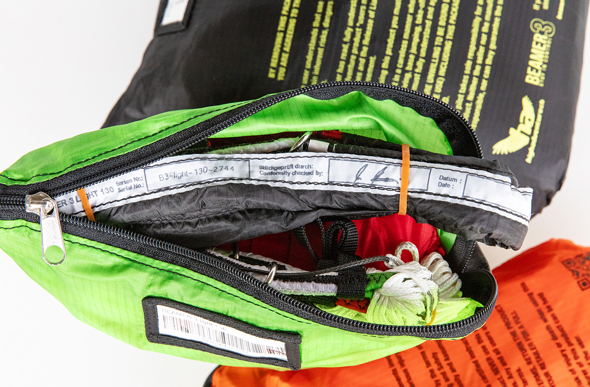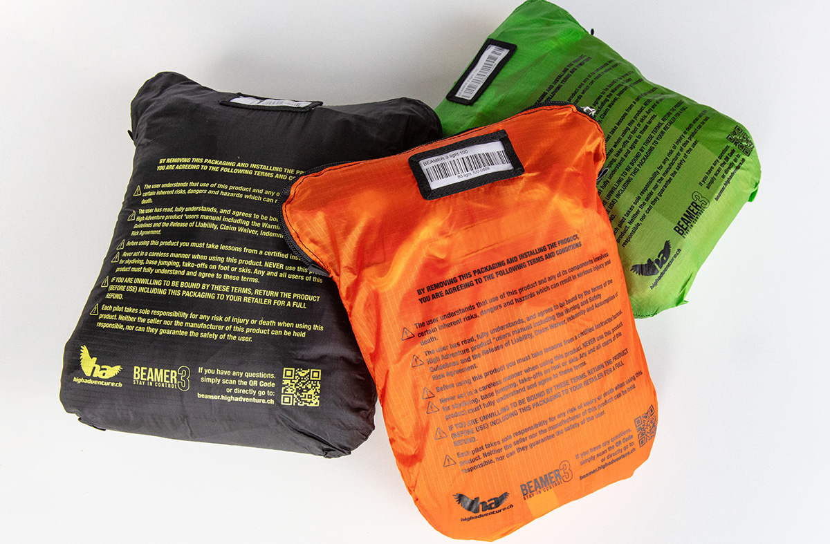 Från och med nu levereras din Beamer 3 i en cool, modellspecifik färgad ripstop-påse – helt tryckt med den fullständiga ansvarsfriskrivningen bla bla. Den bästa delen? Din kund kan återanvända väskan som en praktisk tillbehörspåse för prylar i sin paraglider-ryggsäck. Och när du packar upp den, dyker typetiketten ut direkt – vilket gör det enkelt att fylla i tillverkningsår. Måste älska det!
