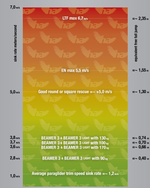 Förutsatt en nödskärmen är öppen med sin flygskärm i en stabil situation är det näst viktigaste sjunkhastigheten. Låg vingbelastning och måttlig hastighet framåt ger Beamer 3 en oöverträffad låg sjunkhastighet.