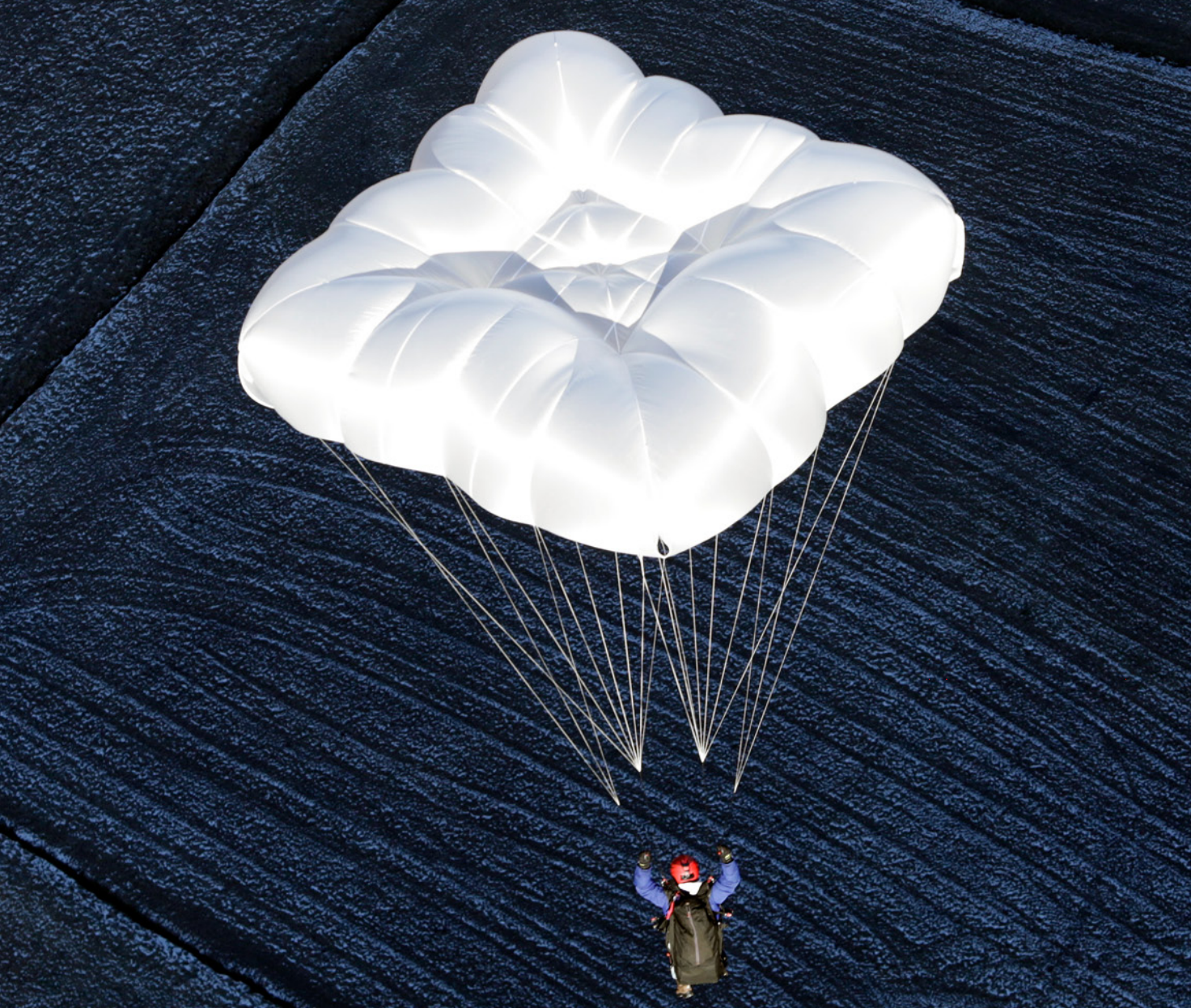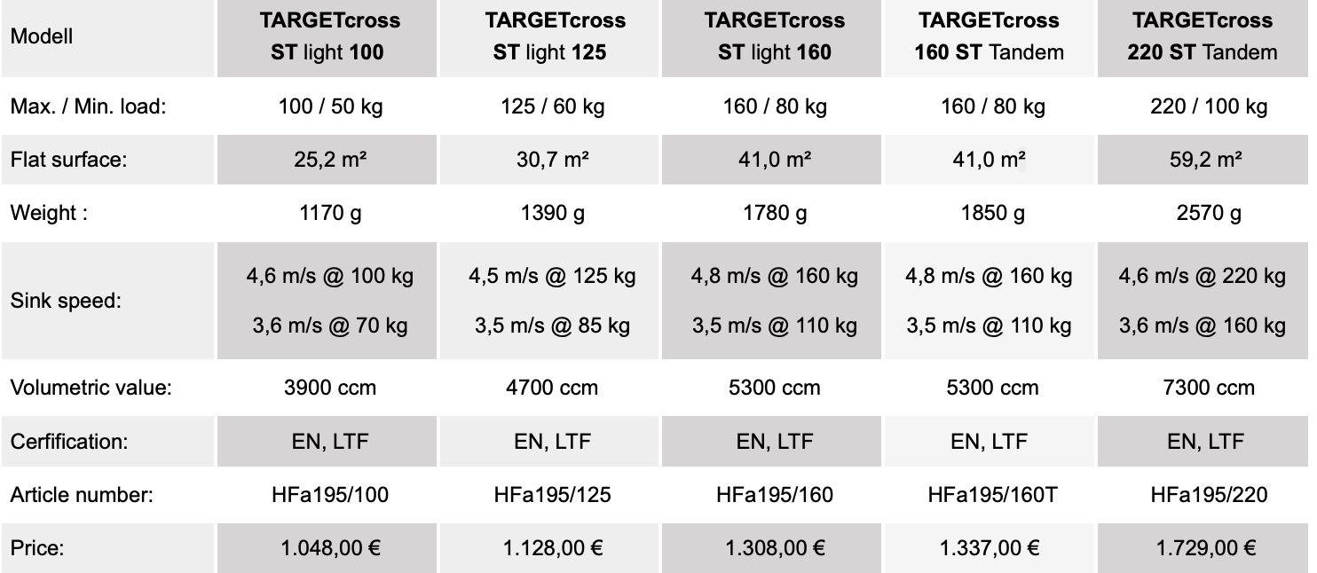 Den superlätta TARGETcross ST kombinerar således den låga packningsinsatsen hos runda och korsformade nödisar med kontrollerbarheten hos Rogallo räddningssystem. För TARGETcross finns det ingen risk för ett ”nedplan” direkt efter frisläppandet, vilket är typiskt för Rogallo räddningssystem även efter förbromsning om de öppnar med toppen nedåt.