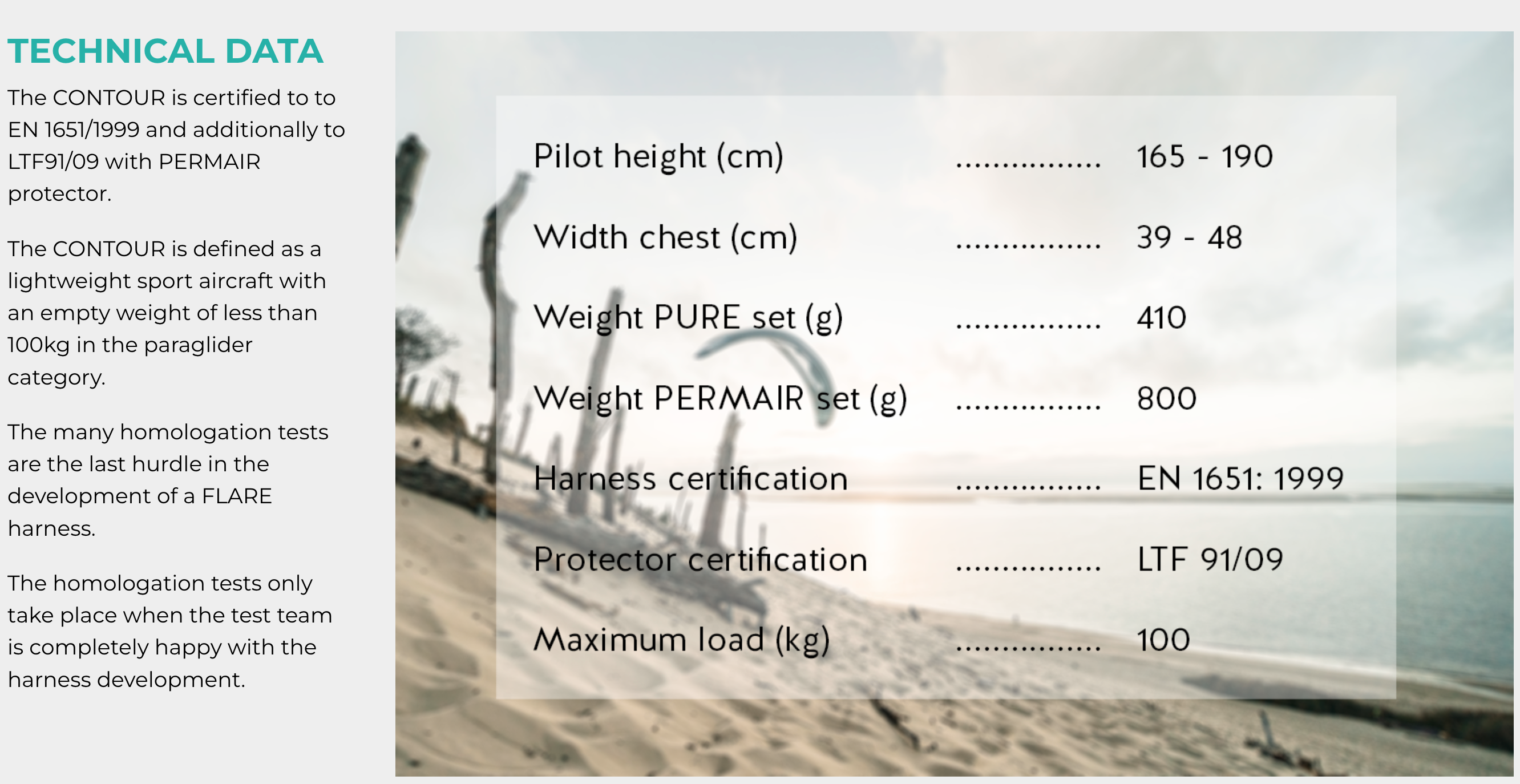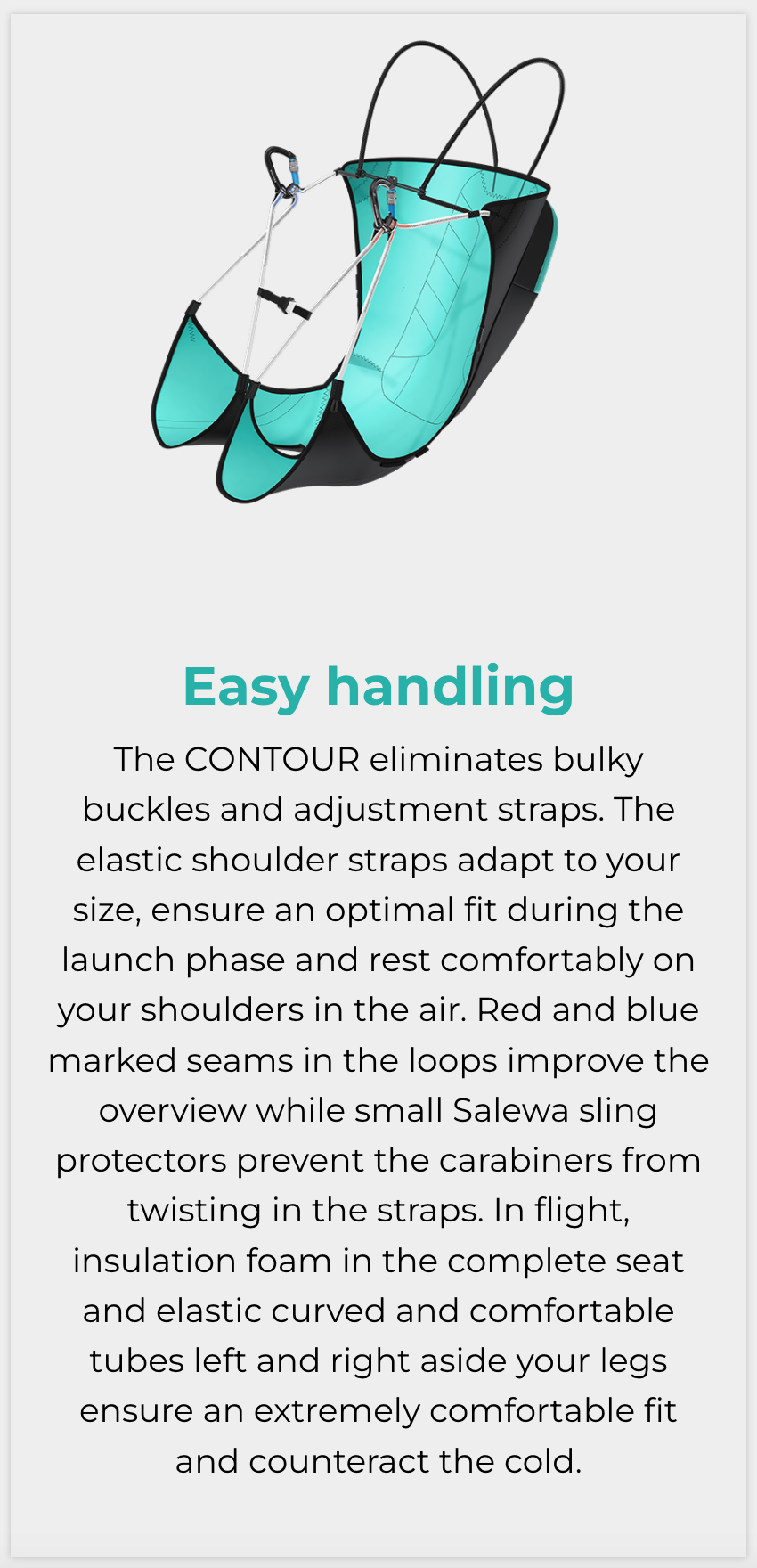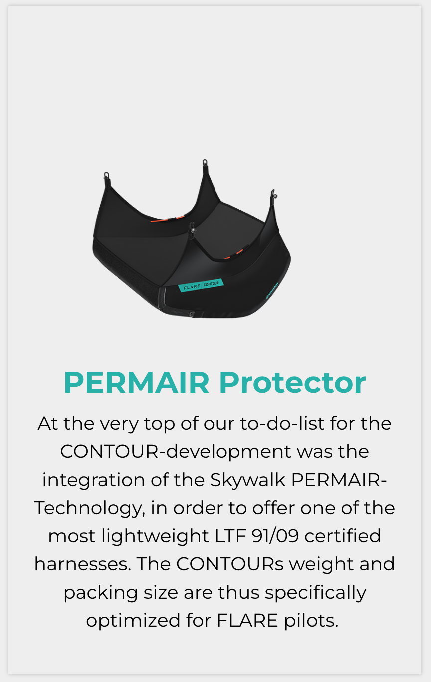 CONTOUR är en enkel sele som uppfyller de höga kraven för parakiting inom områdena Soaring, Snowkiting, Speedflying och Speedring. Den är lätt, bekväm, solid och även utrustad med ett LTF 91/09-certifierat PERMAIR-skydd.