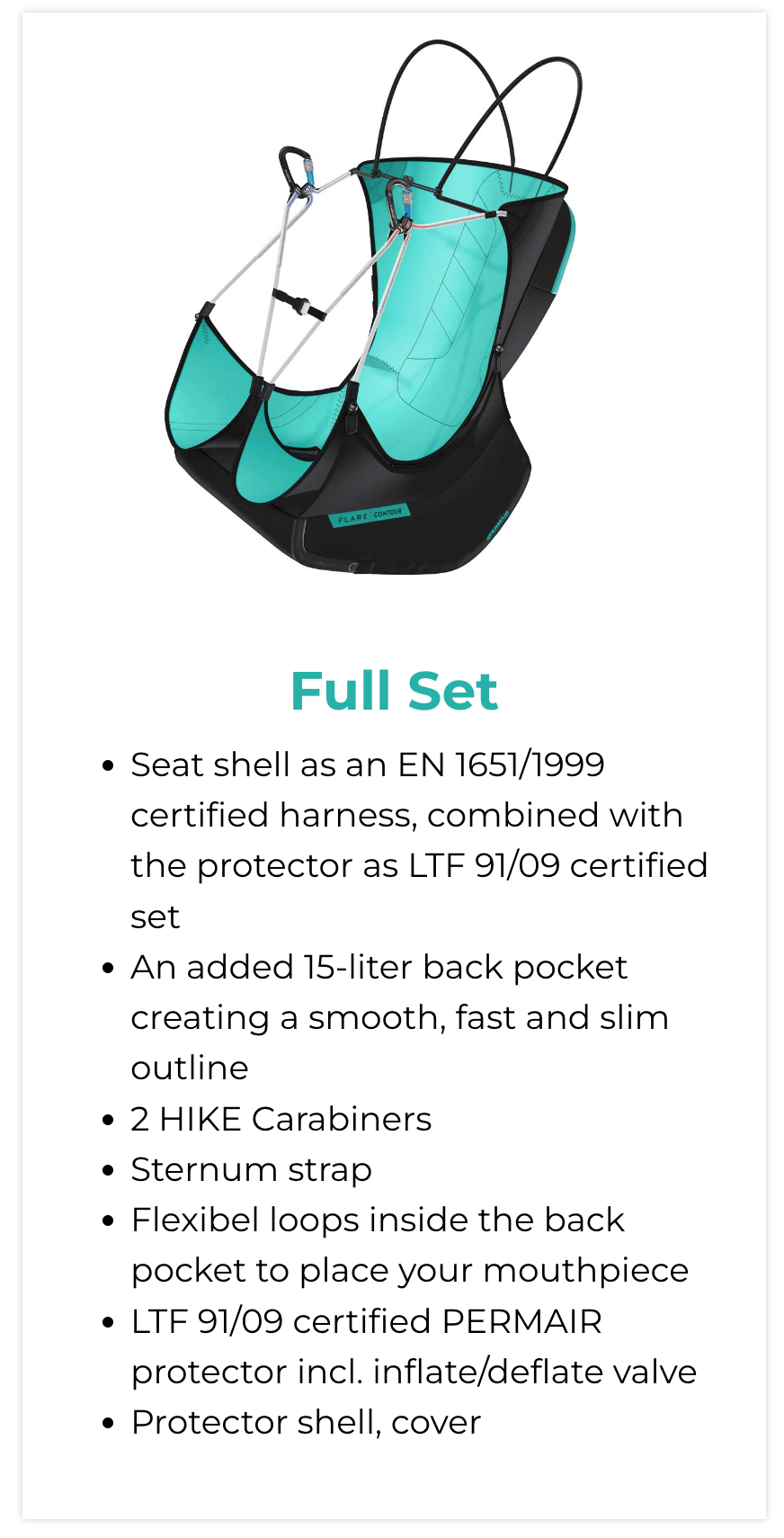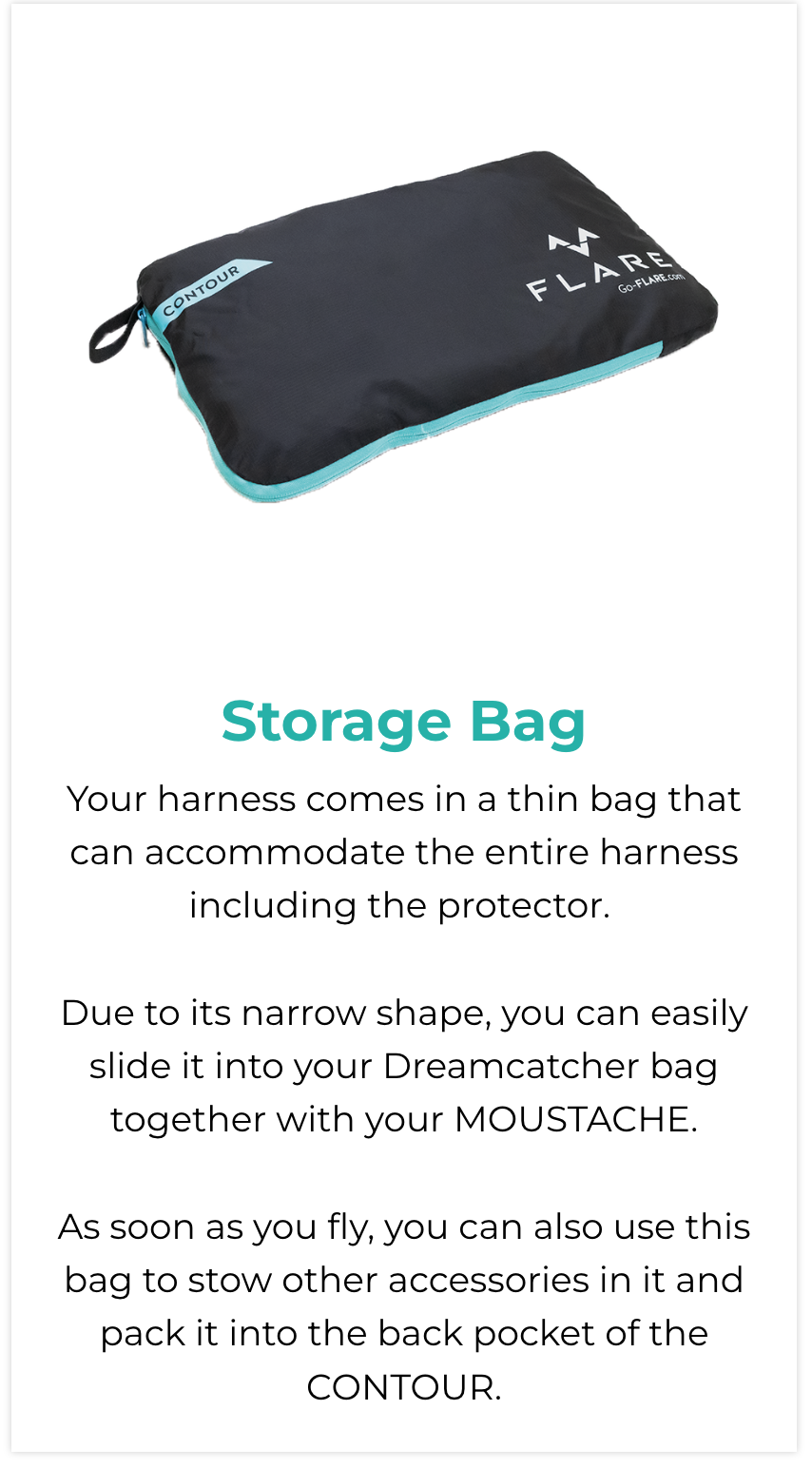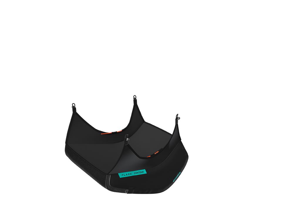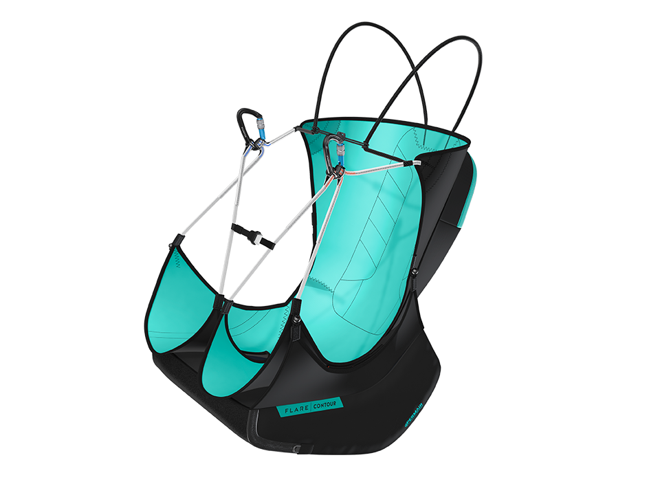 Eftersom FLARE selen för våra parakiters inte kräver acceleratorer och störande remskivor kan CONTOUR minskas i vikt ytterligare. Den minimalistiskt designade bakfickan med 15-liters kapacitet ger plats för din packväska, munstycket för att fylla PERMAIR-skyddet och småsaker för dagligt bruk.