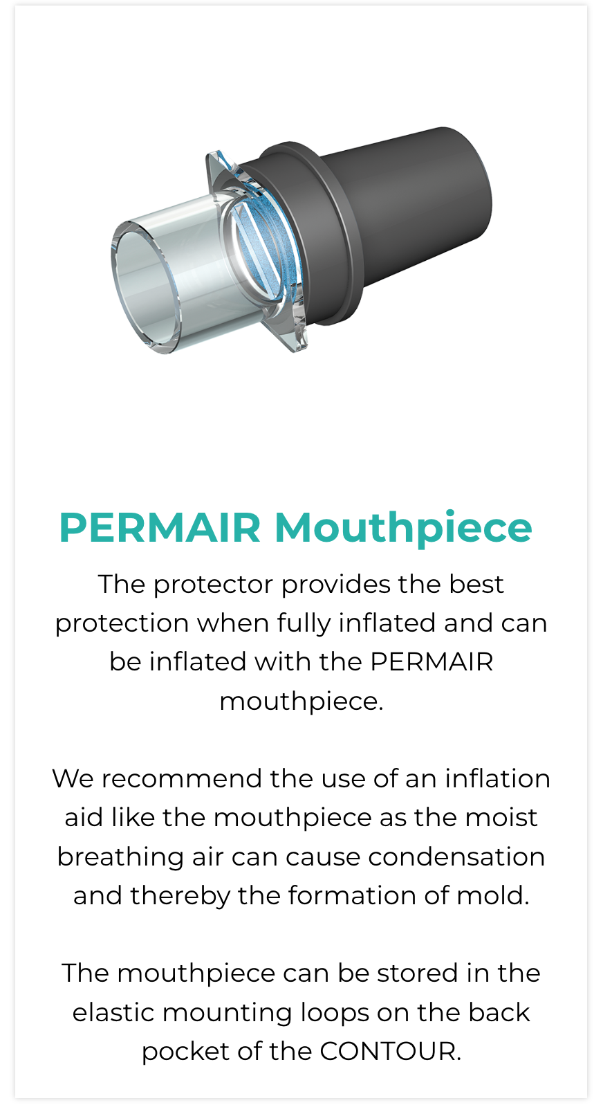 PERMAIR 2.0-skydd kan blåsas upp på ett minimalistiskt sätt via munstycket. Munstycket inkluderar ett fuktfilter för att minimera införandet av fukt och ingår redan i CONTOUR-leveransen.