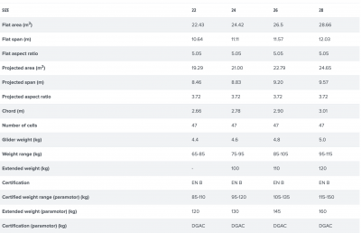Utökat viktområde (24, 26 och 28 storlekar) för flygning vid högre vingbelastningar