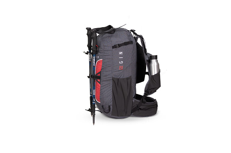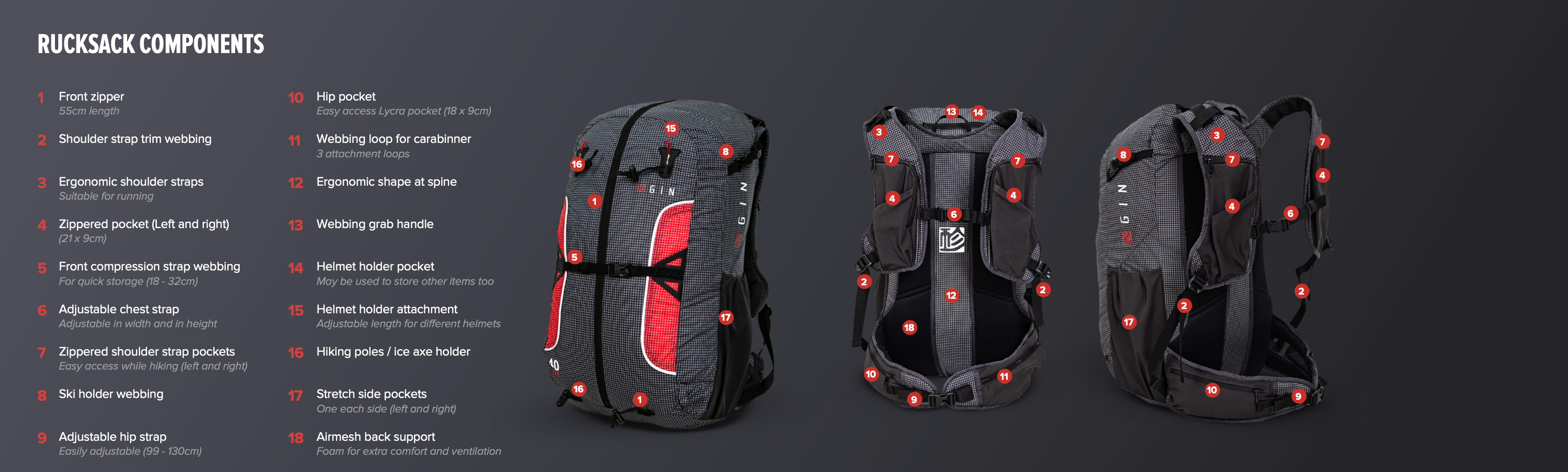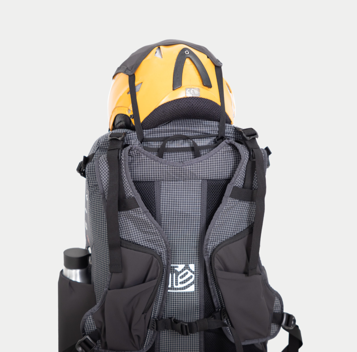 På riktiga fjällexpeditioner måste lagringen vara flexibel och effektiv. För detta designade Gin en hjälmhållare som kan justeras med en enkel trim för att passa de flesta storlekar av hjälm. Detta frigör extra utrymme i ryggsäcken för extra kläder eller bergsklättrarutrustning. Hjälmhållaren kan även användas för att hålla klätterrep vid behov.
