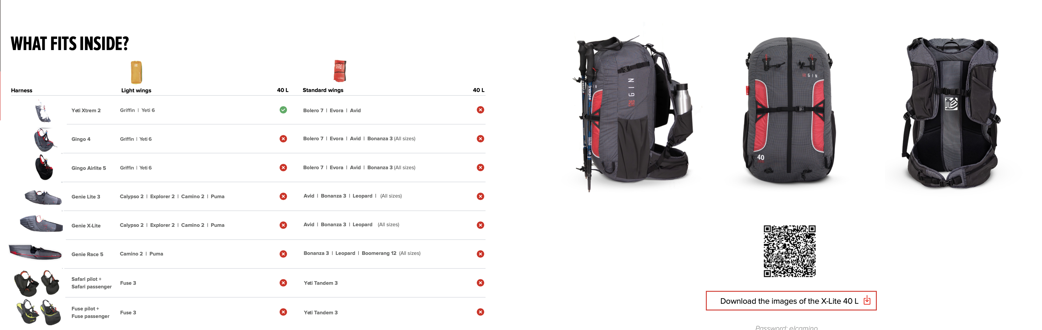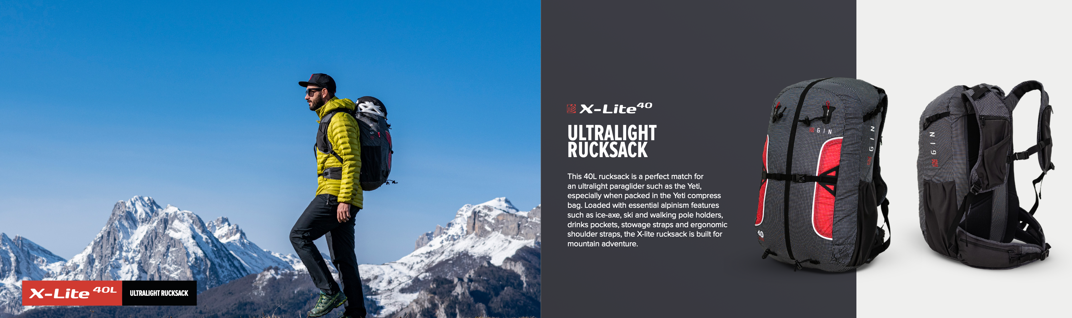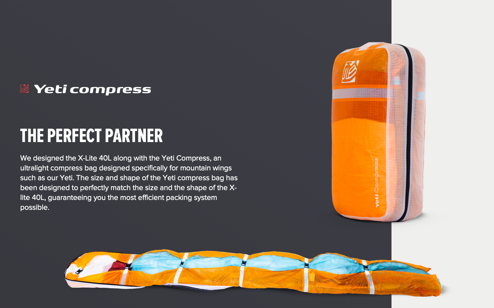 Gin designade X-Lite 40L tillsammans med Yeti Compress, en ultralätt compress bag designad speciellt för UL vingar som  Yeti. Storleken och formen på Yeti-kompressväskan har designats för att perfekt matcha storleken och formen på X-lite 40L, vilket garanterar dig det mest effektiva packningssystemet som möjligt.