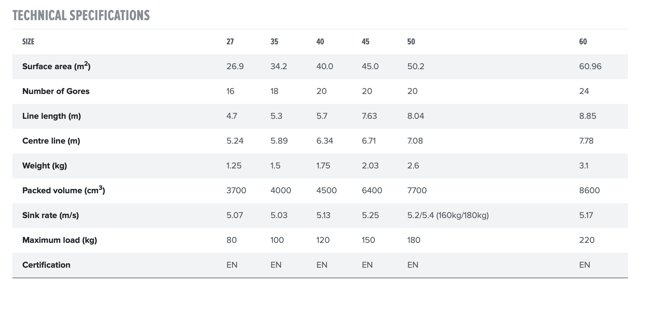 Mellanstorleken väger bara 1,5 kg, men den erbjuder en yta på 35 m2 och en certifierad sjunkhastighet på 5 m/sek., vid en maximal vikt under flygning på 100 kg.