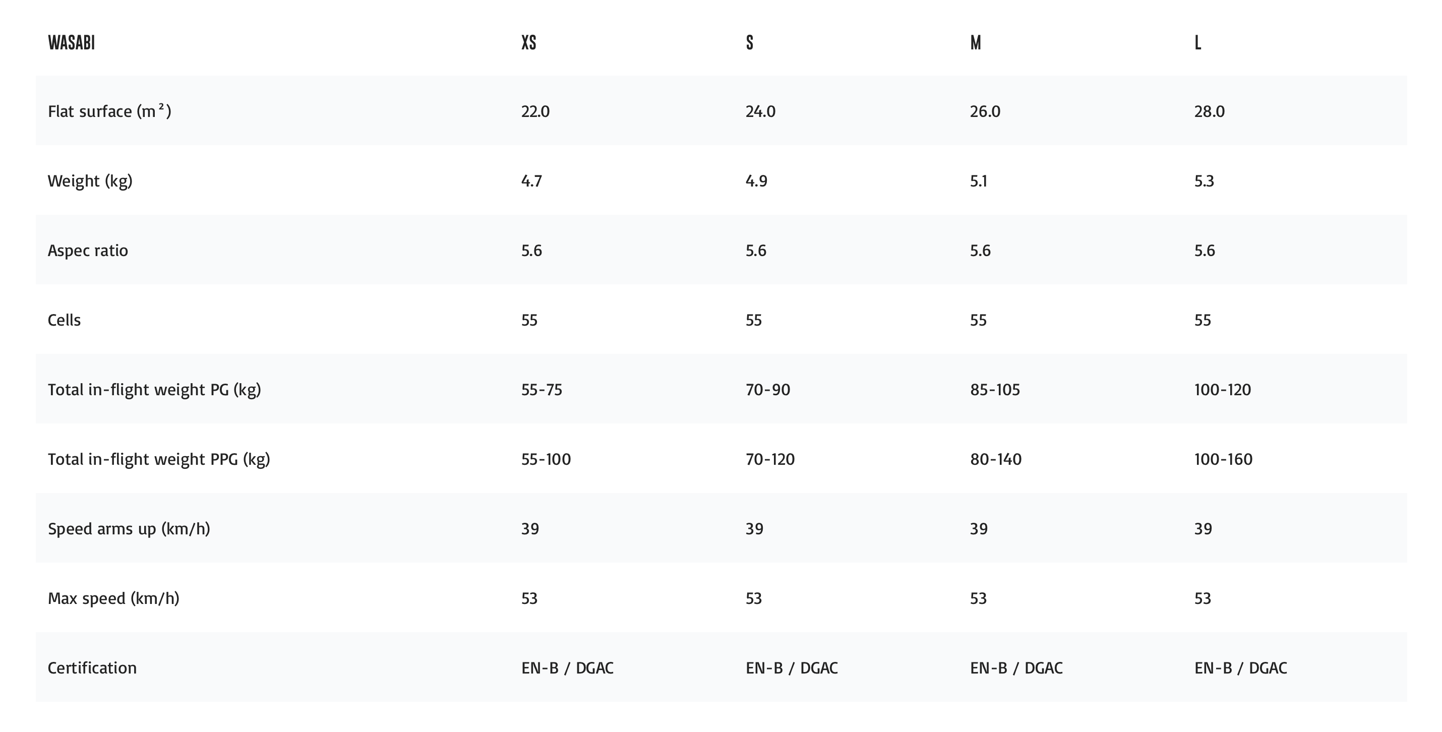 Wasabi utmärker sig i sin klass genom sin stora lätthet i alla faser av start, flygning och landning. Exemplarisk med mjuk och progressiv start och ålandning, vilket förmodligen gör den till en av de bästa vingarna för att lära sig aerobatik. Kort sagt, ett skärm att prova akut! Oavsett din flygnivå kommer du säkert att bli behagligt charmad!