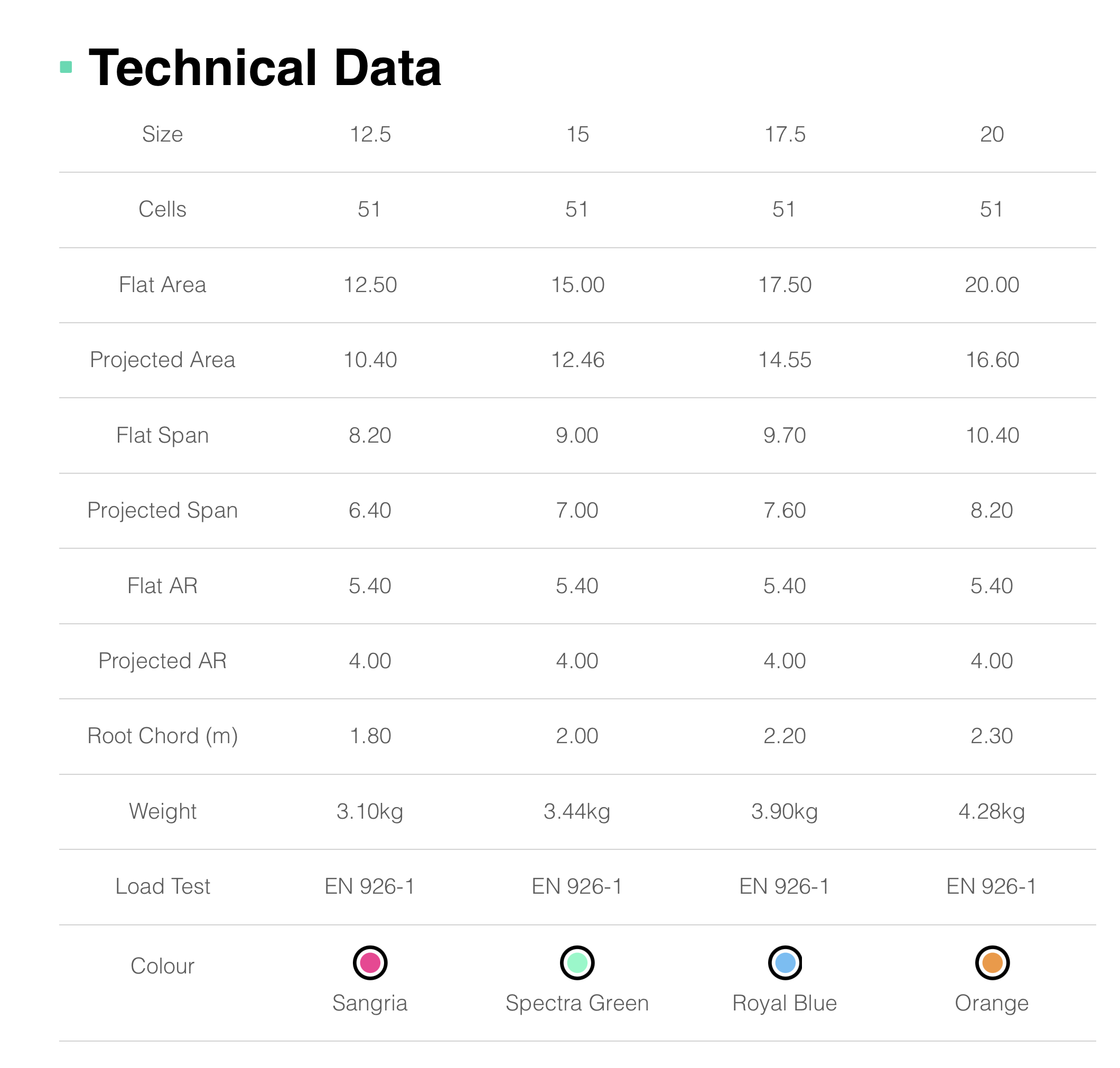 Slitstarka Skytex-tyger används i hela vingen. Framkanten och vingspetsarna är förstärkta, medan riser-sektionerna är tillverkade av stabila material med utbytbara Dyneema-sektioner, byggda för långvarig prestanda.