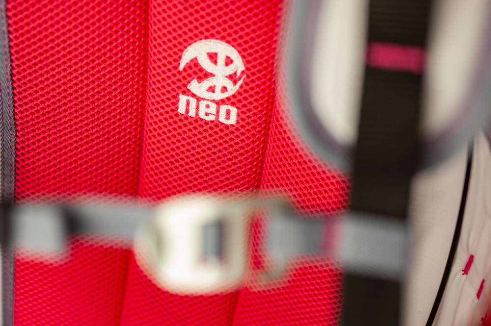 Huvudmaterial: tyg och remmar i Polyamid, Mesh3D polyester, PE skum, NEO aluminium manuell spännen, läder.