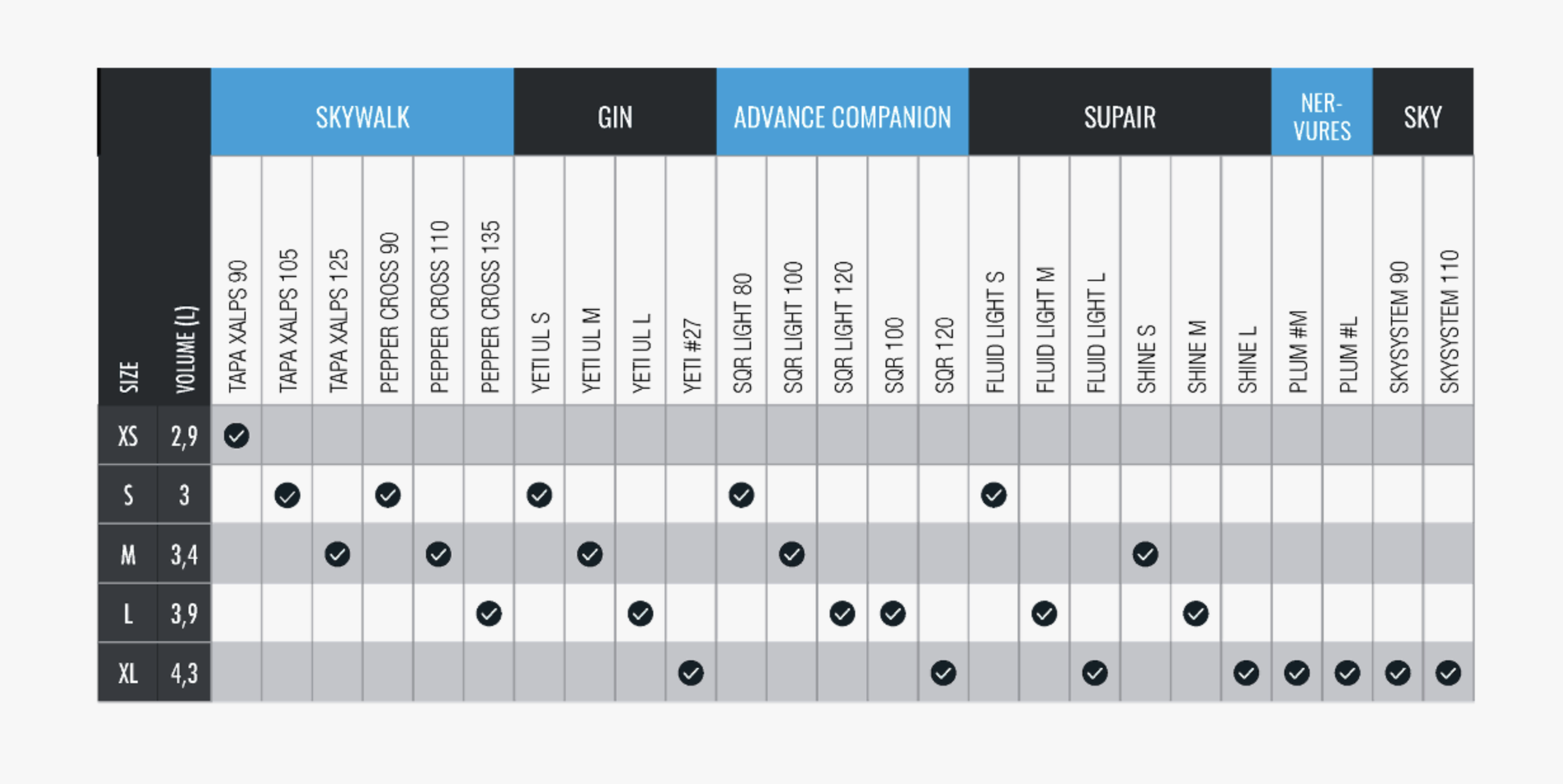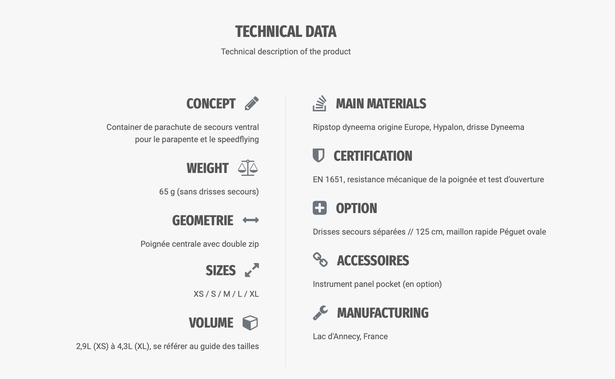 Container Lite 2.0 accepterar alla typer av lätta nödskärmar tack vare att den finns i 5 storlekar. Den anpassar sig till alla bergsselar utrustade med lämpliga karbinhakar. Tyget har valts ut för att erbjuda ett mycket effektivt vikt/hållbarhetsförhållande.