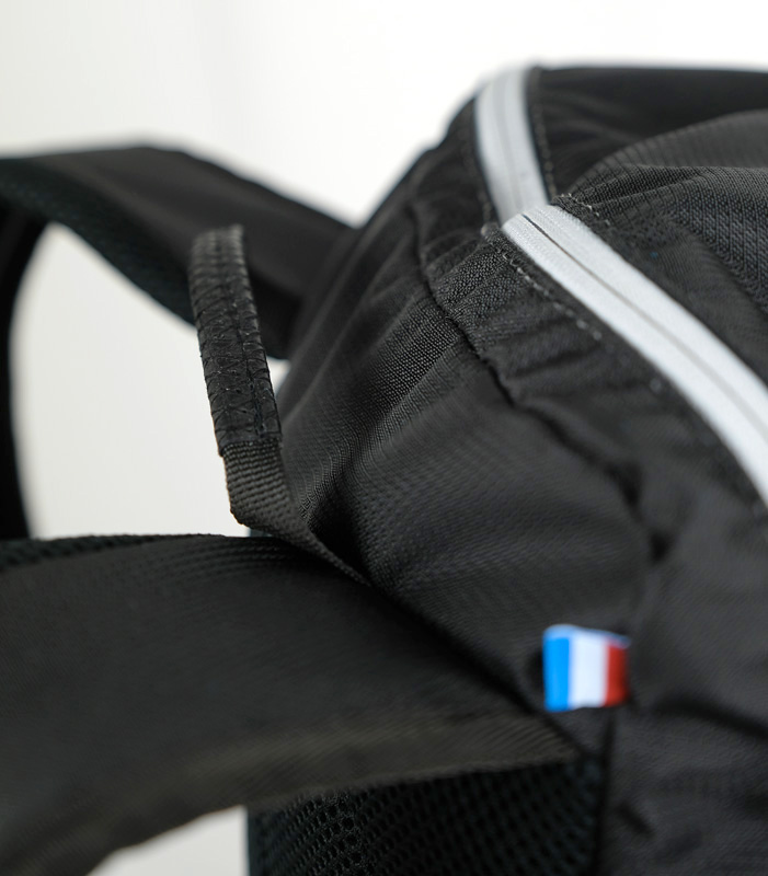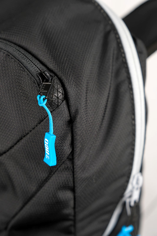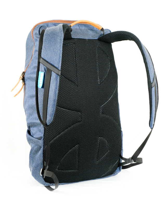 Tyg och material: vattenavvisande Nylon (svart) / denim cordura Dyneema (blå), läder, 3D-nät, YKK-dragkedja, Hypalon