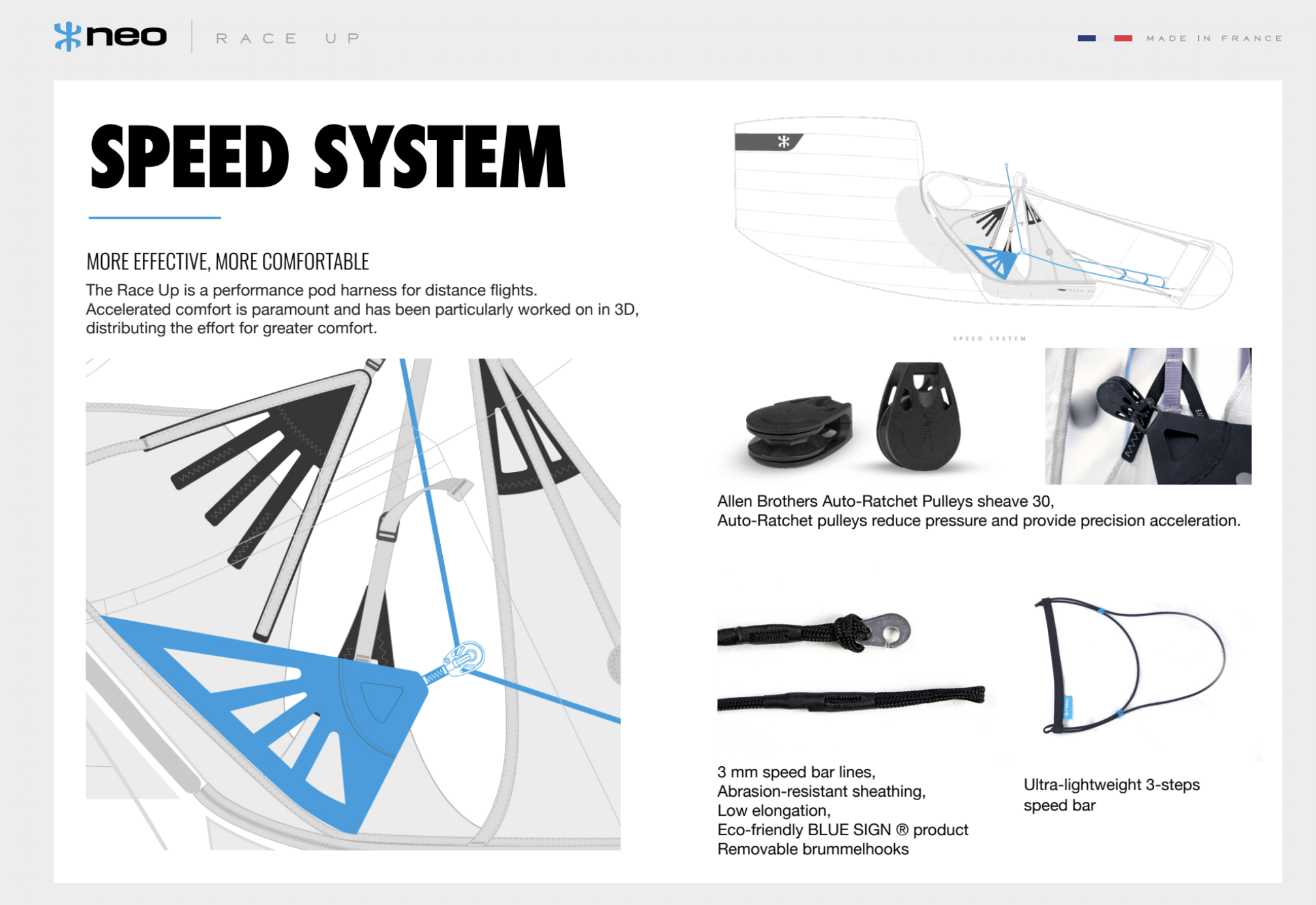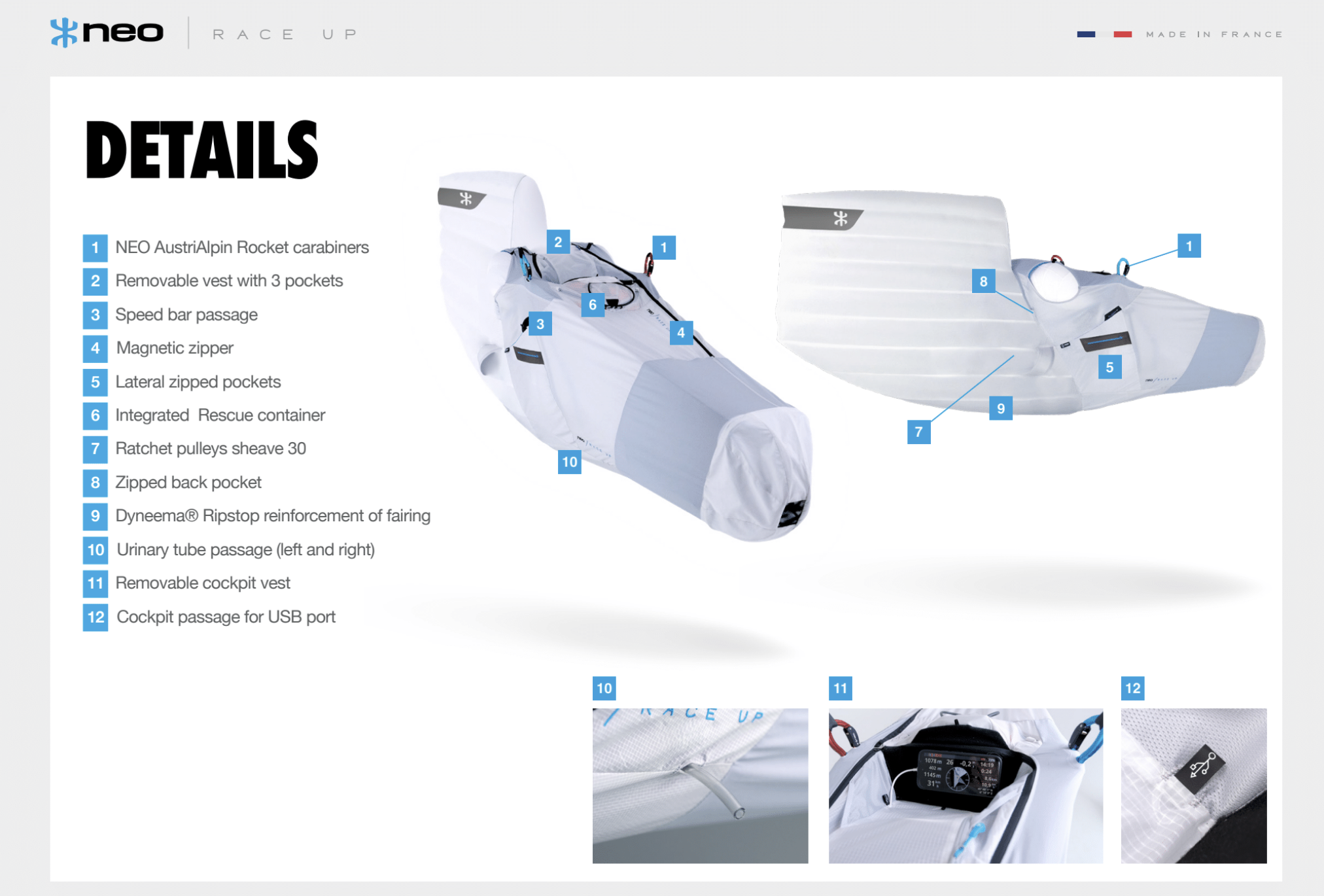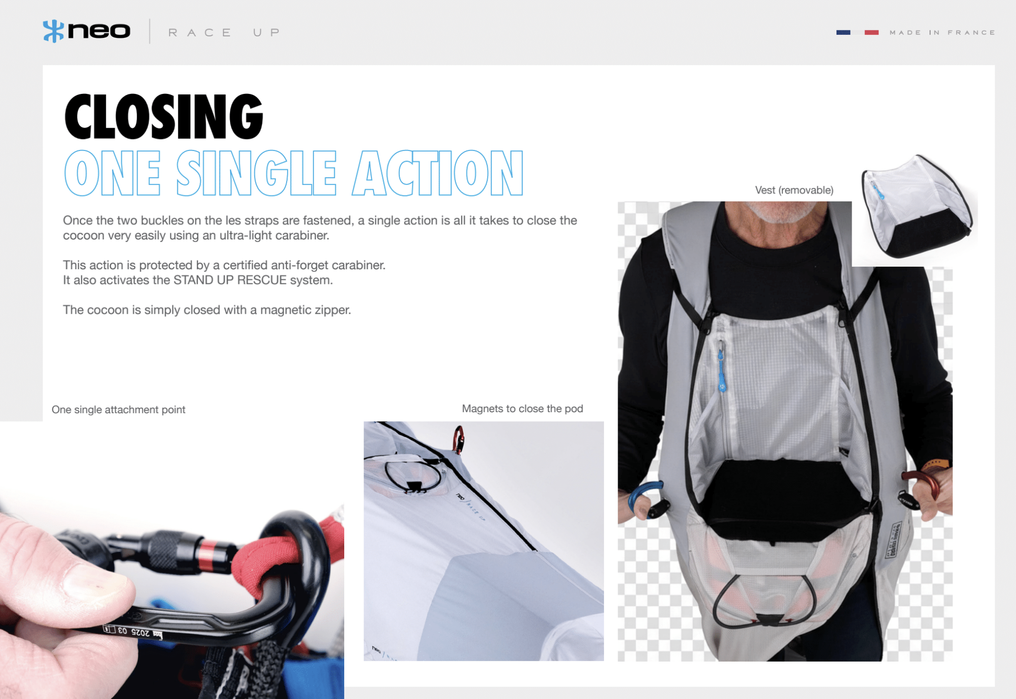 Ultralätt sele med högpresterande pod, Stand Up Rescue System, aerodynamisk väst och många andra förfinade detaljer finns tillgänglig i fyra storlekar från S till XL.