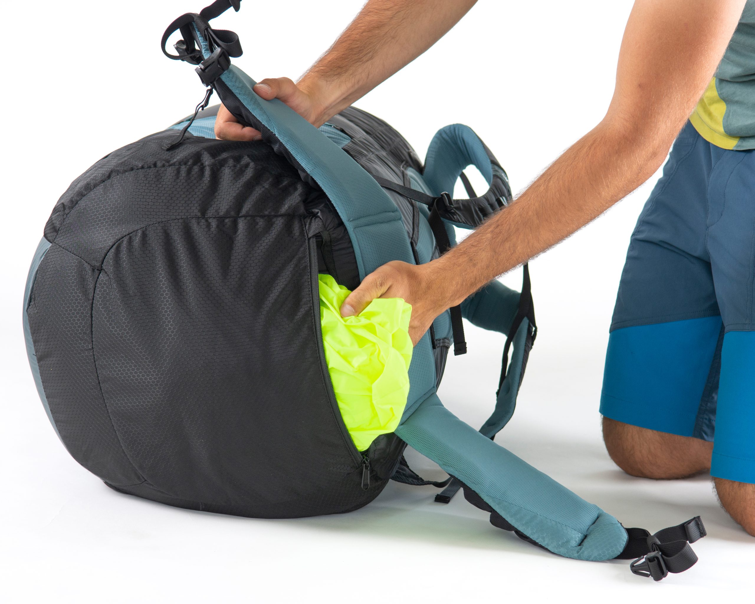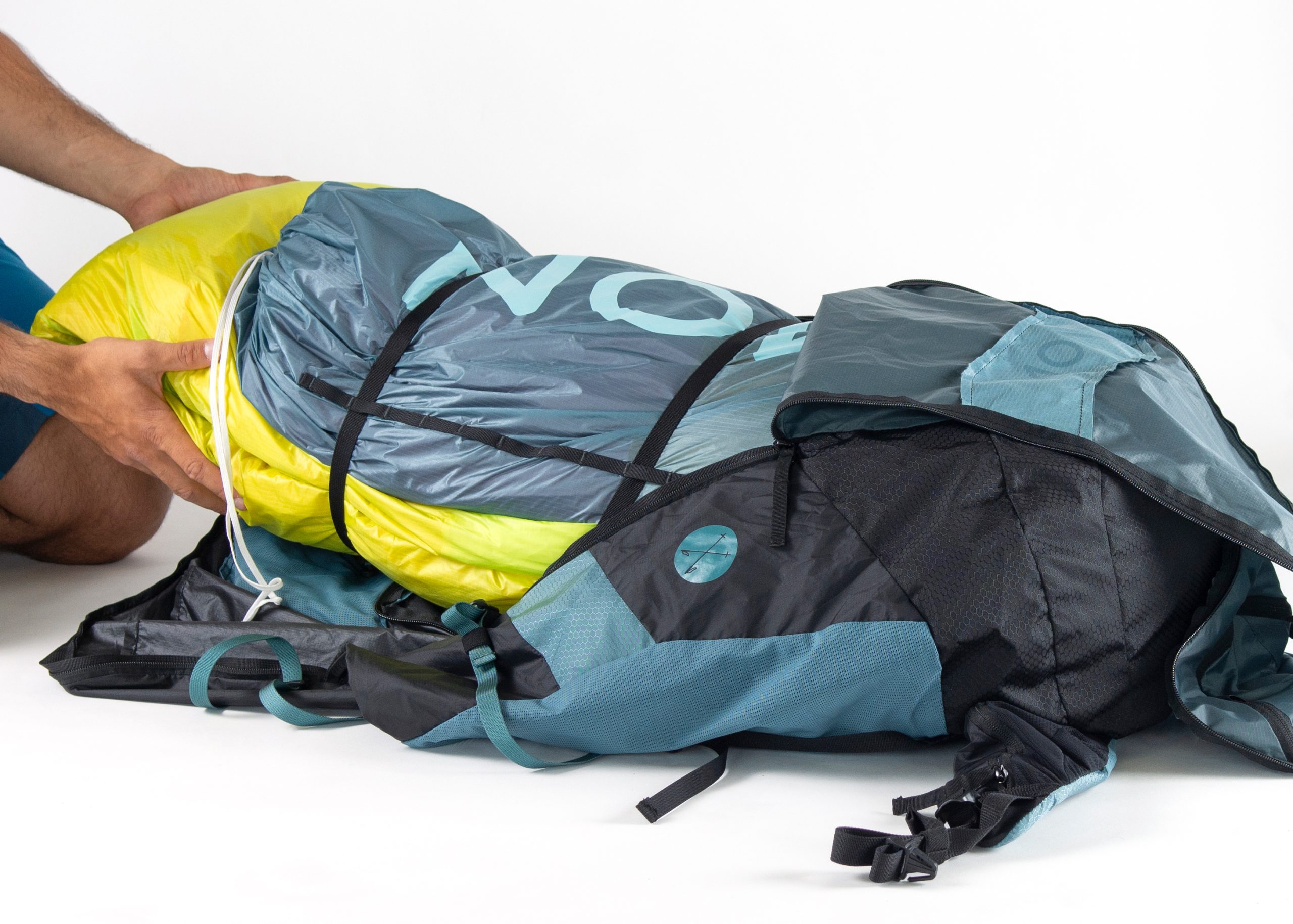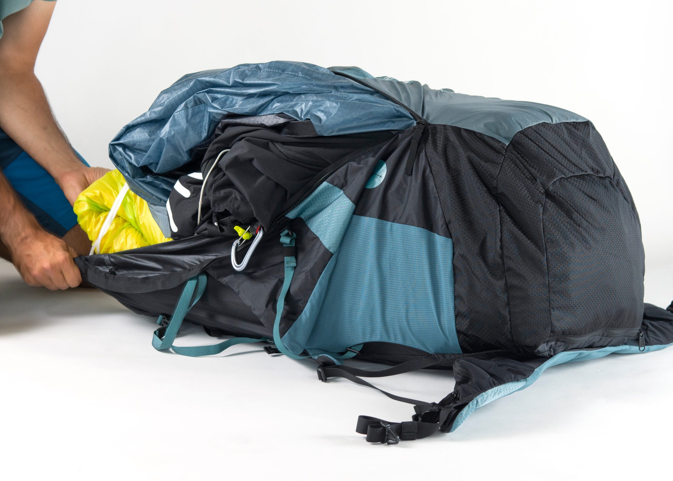 Produktutvecklaren Michael Kantioler förklarar hur han packar FERUS: ”Jag viker min vinge till storleken på ryggsäckens baklängd, lägger min sele ovanpå den och drar sedan ihop den ungefär tre fjärdedelar av vägen på båda sidor. Hjälmen (flyginstrumenten är väl skyddade inuti hjälmen), kläderna och andra föremål placeras sedan i det återstående utrymmet ovanför. Om utrymmet är trångt kan du även transportera hjälmen på lockfacket med hjälp av det avtagbara hjälmnätet.” Har du en skärm med ridgifoils som behöver packas ner i en Consertinapåse kan du även lägga eller linda selen inuti när du viker skärmen och på så sätt klara dig utan packrullen.