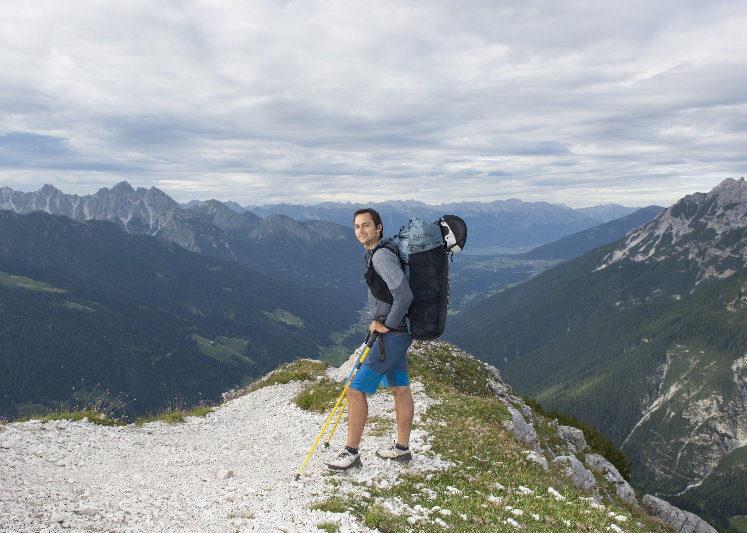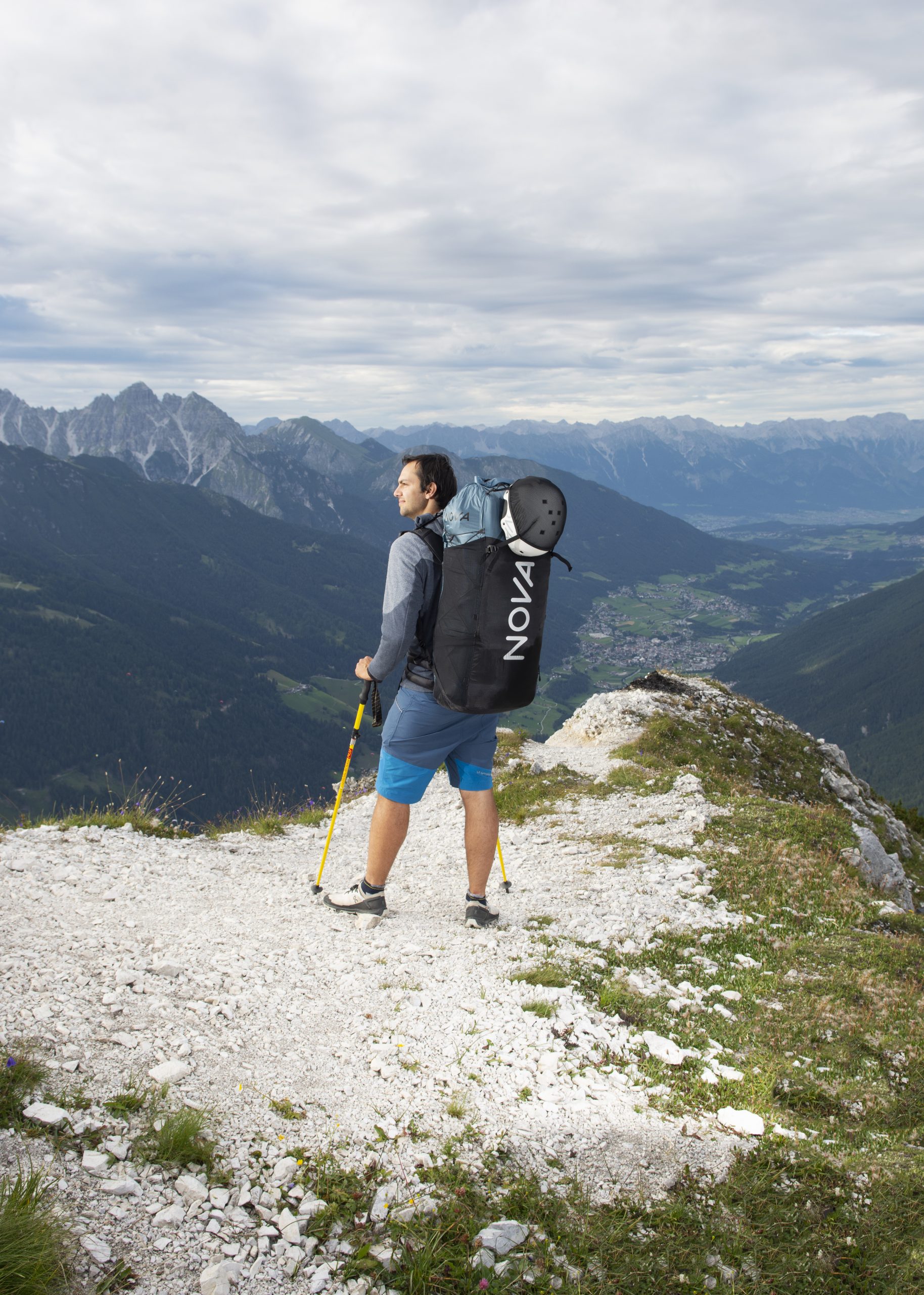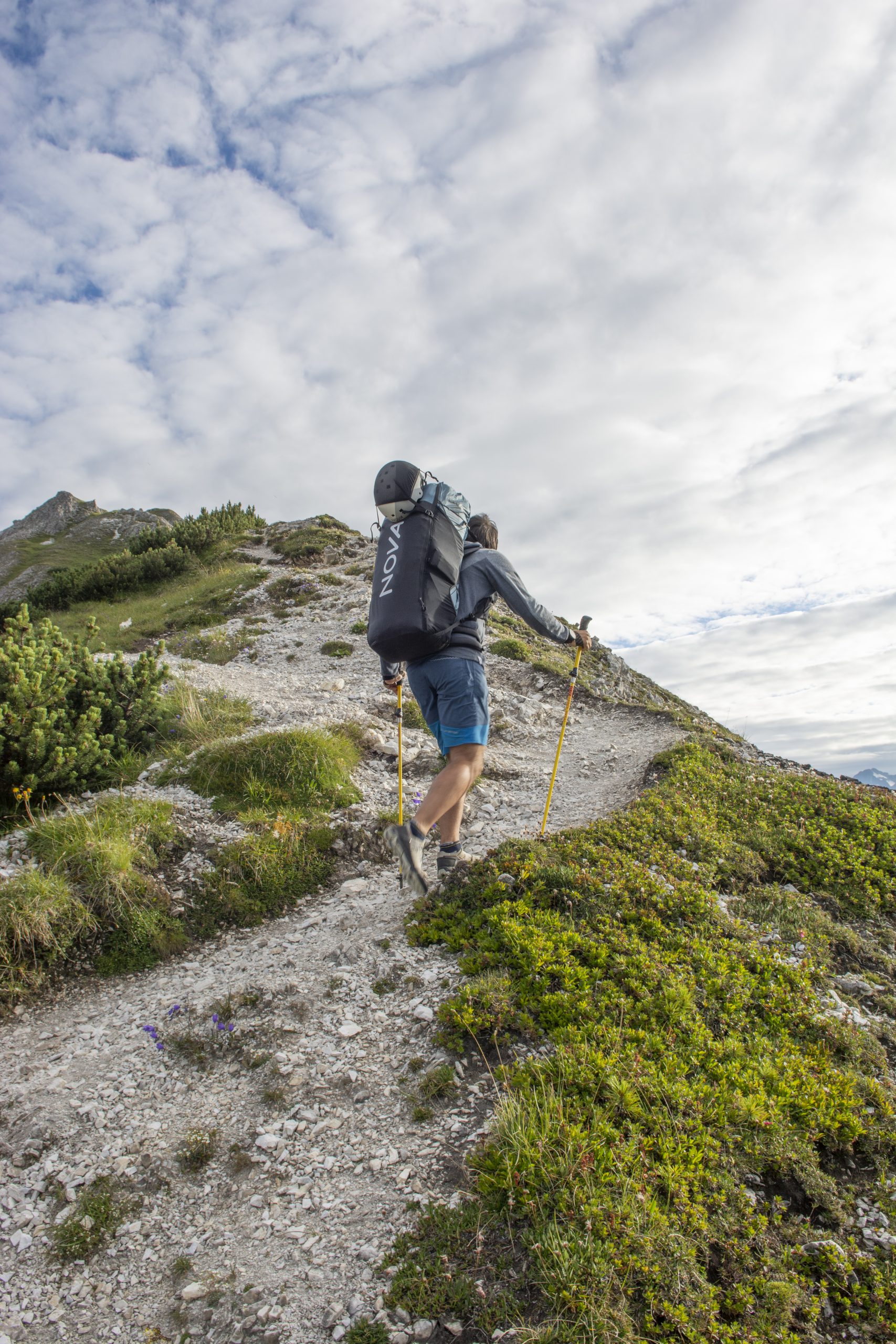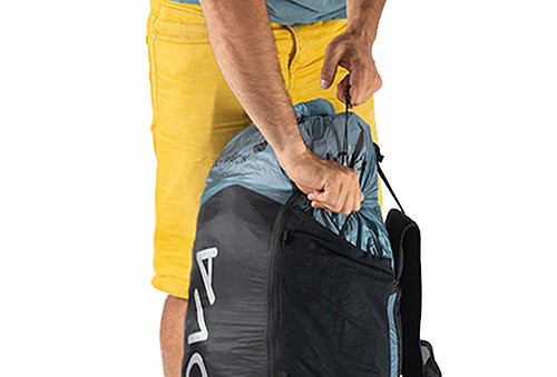 Belastningen kan antingen fördelas huvudsakligen på höftbältet eller över hela överkroppen. En lång och platt packad vinge fungerar som ett förstyvande ryggelement – som ramen i bärsystemet på en vandringsryggsäck. Om du packar rätt kan du överföra vikten från dina axlar till dina höfter. Med hjälp av lastkontrollremmarna (= upphängningsremmarna mellan axelremmarna och ryggsäcken) kan du justera hur långt bak ryggsäcken hänger: i uppförsbacke ställer du dem lite längre, på plan och nedför kortare. Så det finns olika alternativ för att anpassa komforten hos X-PACK 50 till dina krav. Hemligt tips från hike & fly-entusiasten Till Gottbrath: han viker jackan platt och placerar den mellan baksidan av ryggsäcken och skärmflygaren i ländhöjd. Detta gör att varje hike & fly-ryggsäck passar ännu bättre.