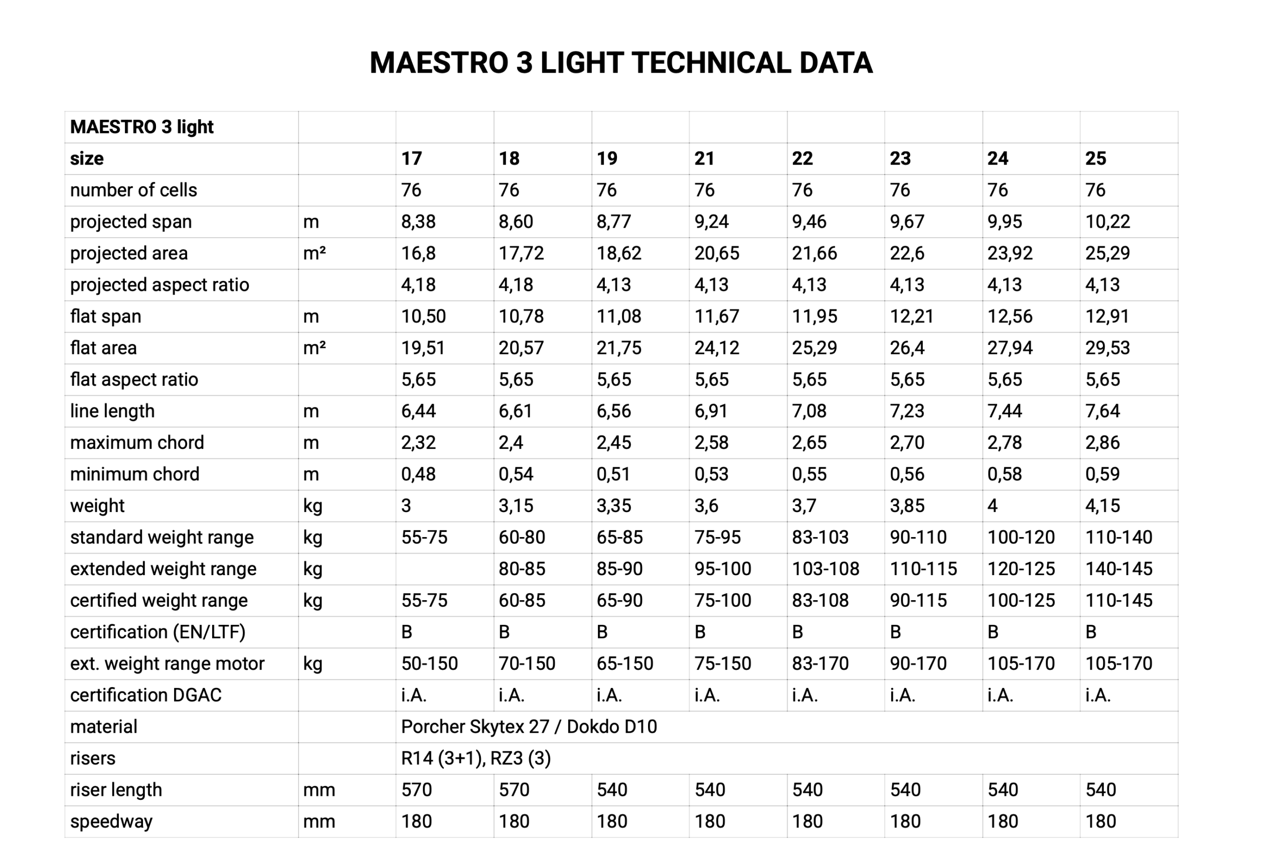 För att nå en bredare målgrupp har MAESTRO 3 light normallängd riser och mer täckta linor.