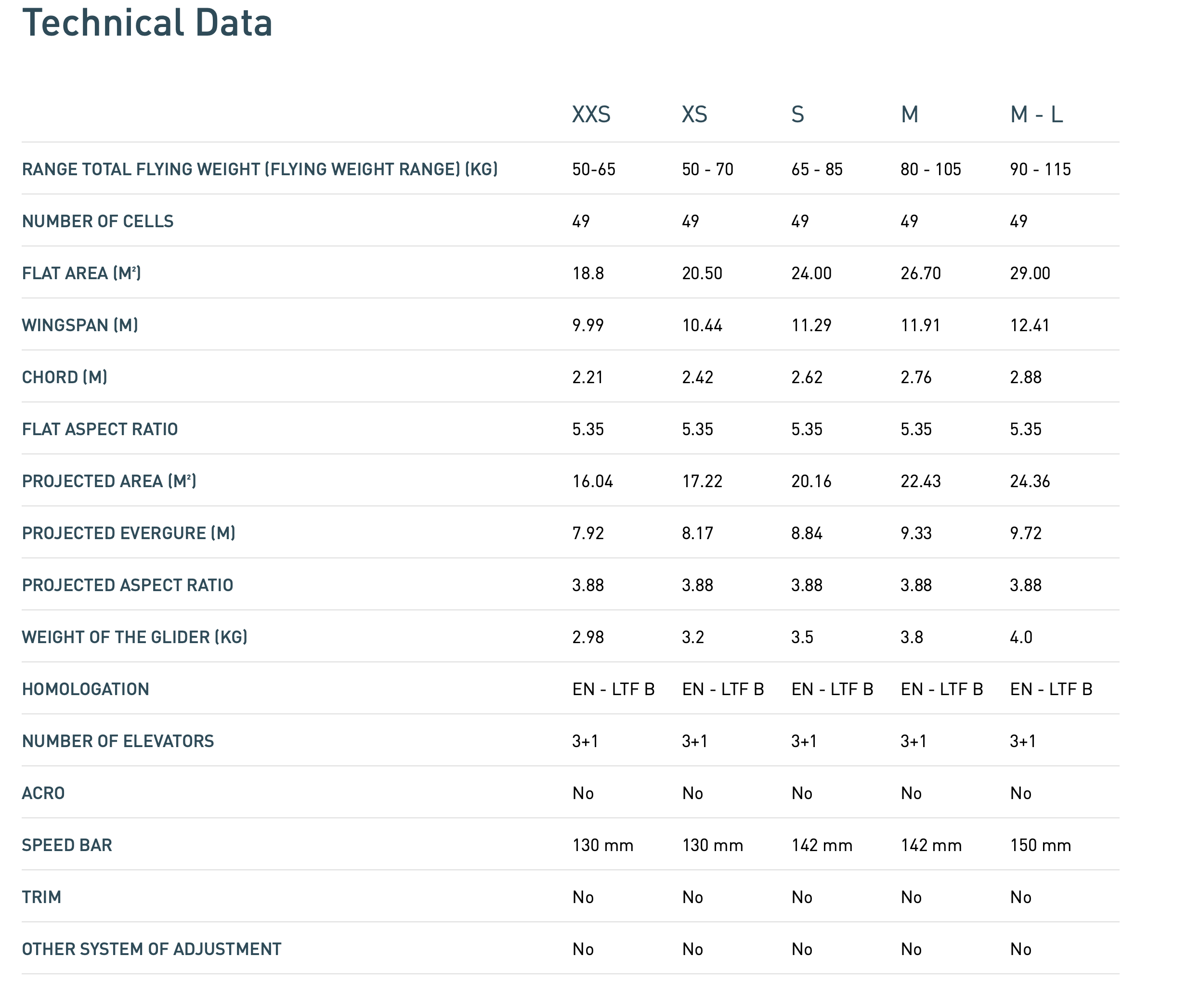 Med en vikt på 3,66 kg i storlek M tar den här lätta och kompakta draken med dig överallt, vare sig det är i luften eller i väskan. Det är det perfekta valet om du vill utvecklas lugnt under flygningen medan du tränar Hike & Fly.